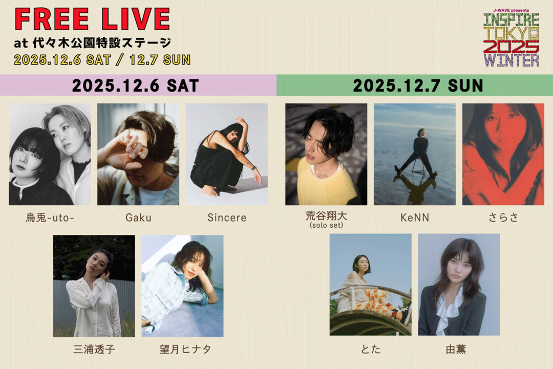 音楽とマーケットが融合した都市型カルチャーフェス「J-WAVE presents INSPIRE TOKYO 2025 WINTER~Best Music & Market~」が12月5日から7日までの3日間、代々木公園イベント広場で開催される。主催はJ-WAVE(81.3FM)。