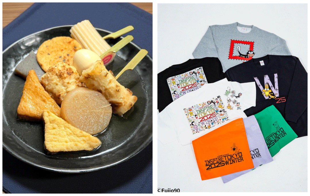左=コラボキッチンカー「赤塚不二夫食堂」から「チビ太のおでん」3種、右=INSPIRE TOKYO×赤塚不二夫祭とコラボグッズ