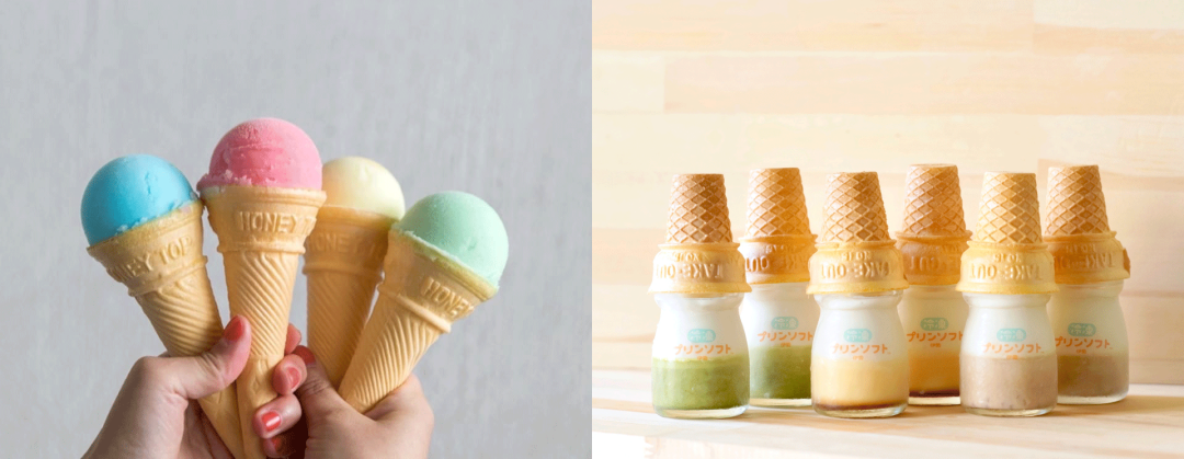 左=青森県・藤田アイス店の「カランカランアイス」。わいらしい色とフォルムが特徴 右=三重県のご当地アイス「プリンソフト」。プリンとソフトクリームが合わさった味わい