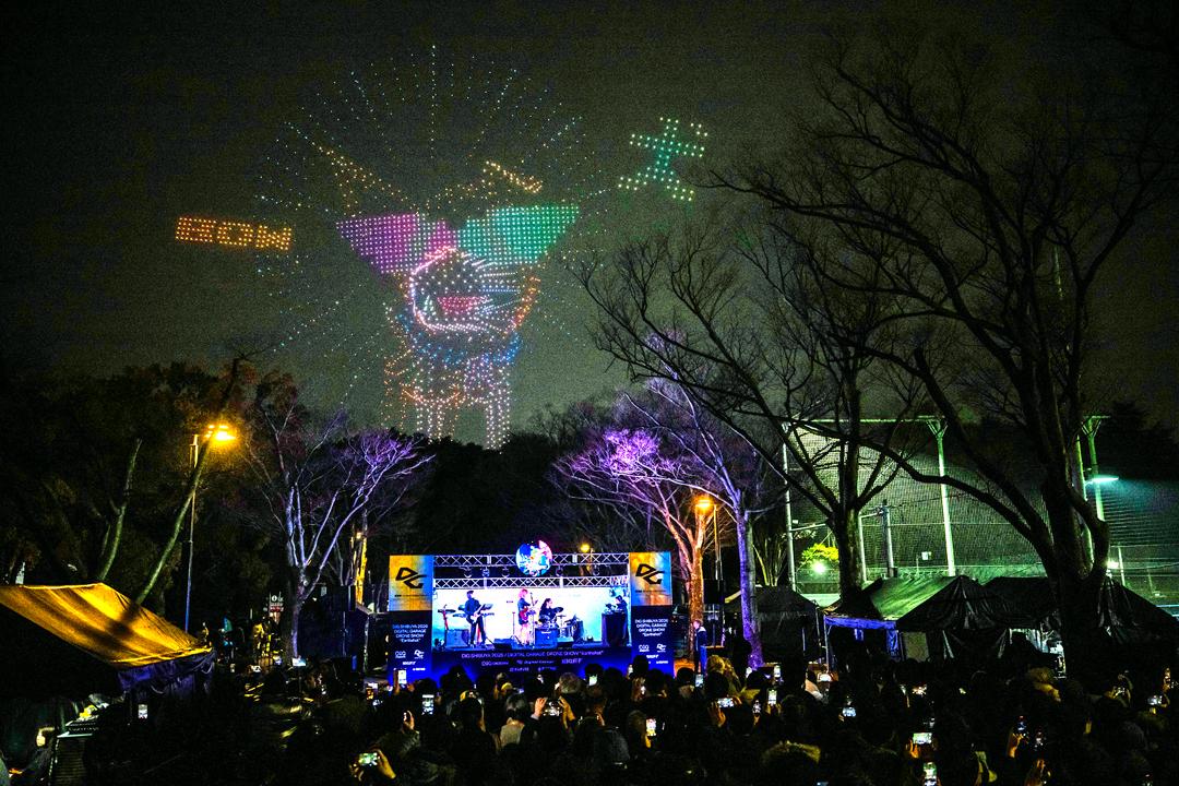 同時に、YMOの代表曲「Technopolis」の演奏がスタート。音楽プロデューサーの日向大介さん率いるencounterが生演奏で共演し、ドローンと音楽が同期するダイナミックなライブが展開された。