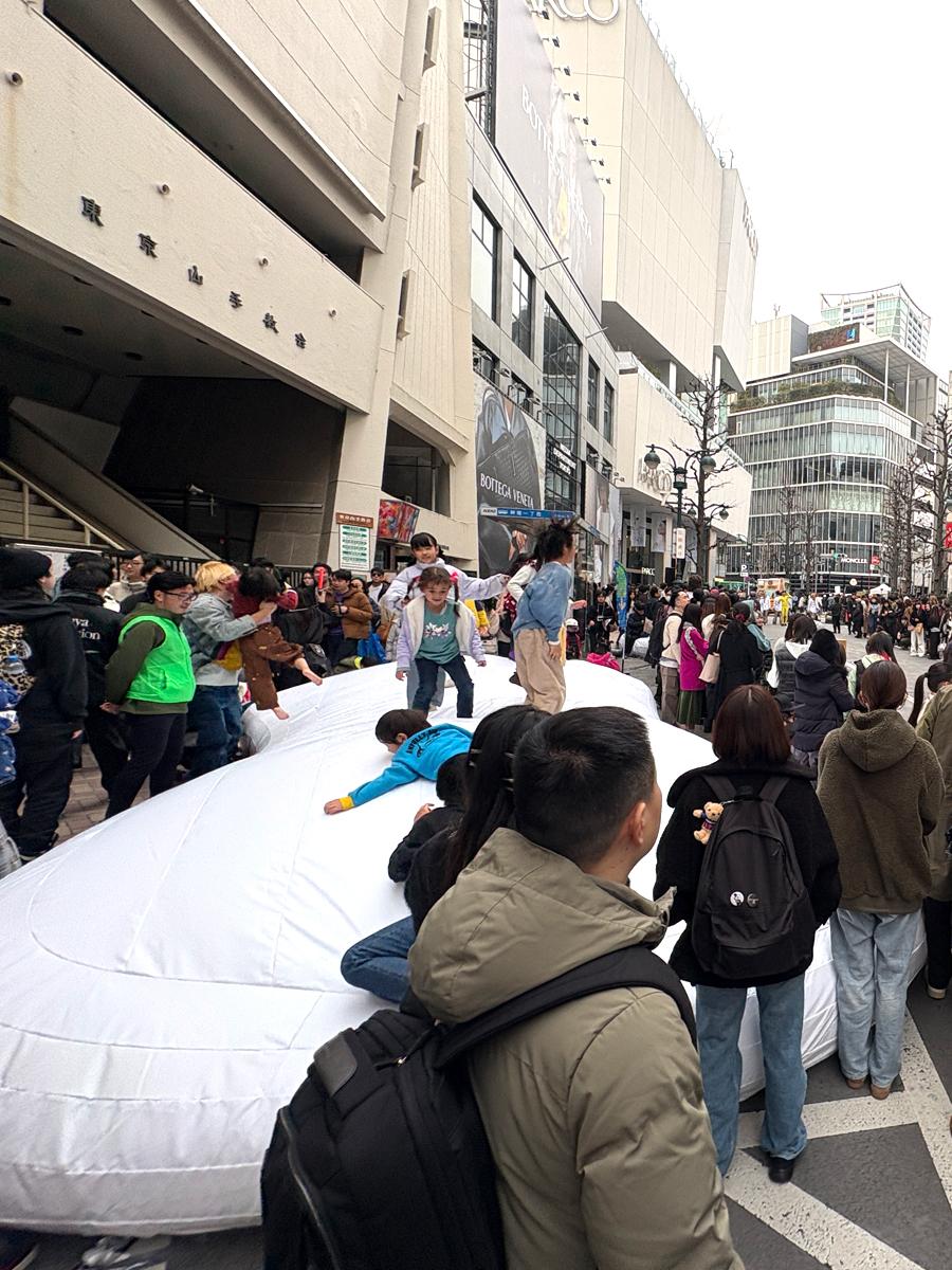 公園通りに設置された「白いバルーン」に腰掛けたり、寝転んだりする人の姿や、子どもたちがその上で跳ねて遊ぶ様子も見られた