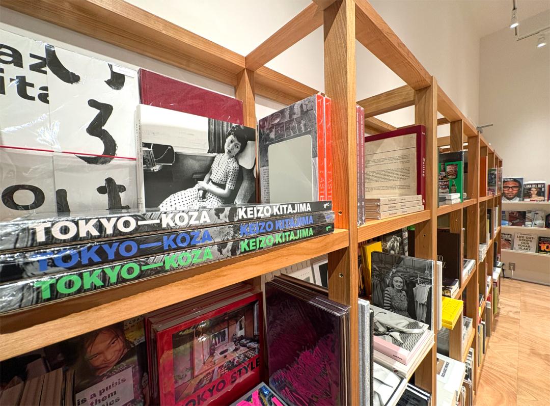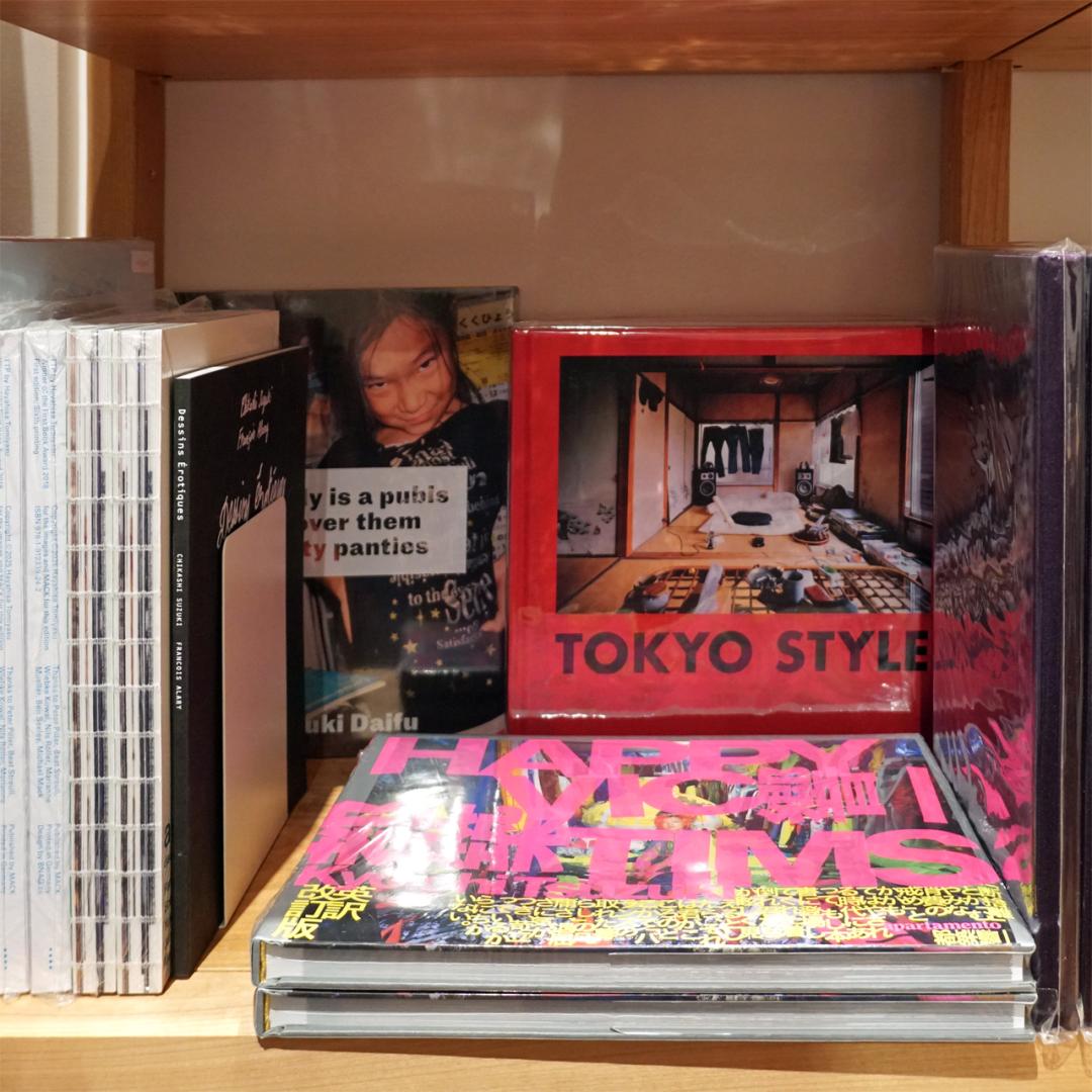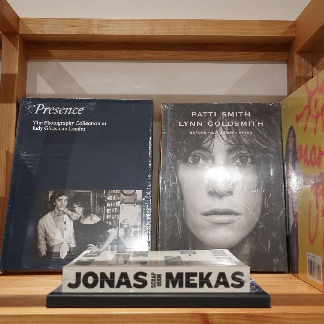 都築響一の『TOKYO STYLE』『HAPPY VICTIMS』、リトアニア出身の映像作家ジョナス・メカスのスクラップブック、リン・ゴールドスミスが撮影したパティ・スミス写真集など、多彩なビジュアルブックが書棚を彩る