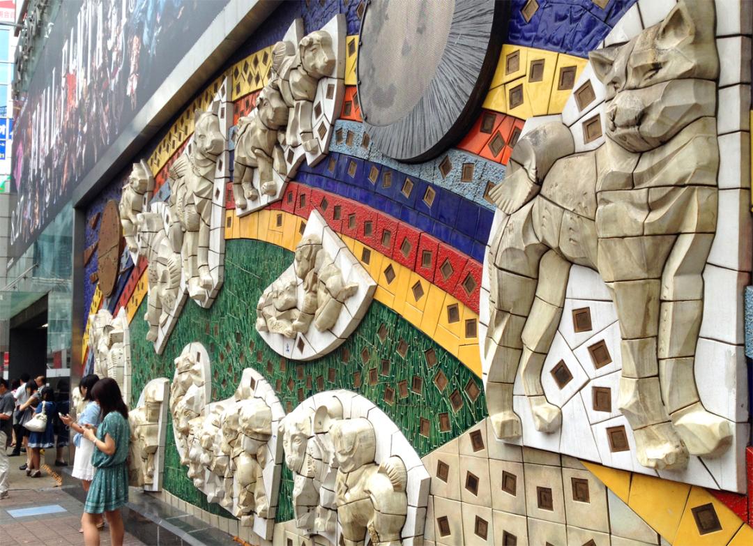 ハチ公前広場の陶板レリーフ《ハチ公ファミリー》(撮影2013年8月22日)