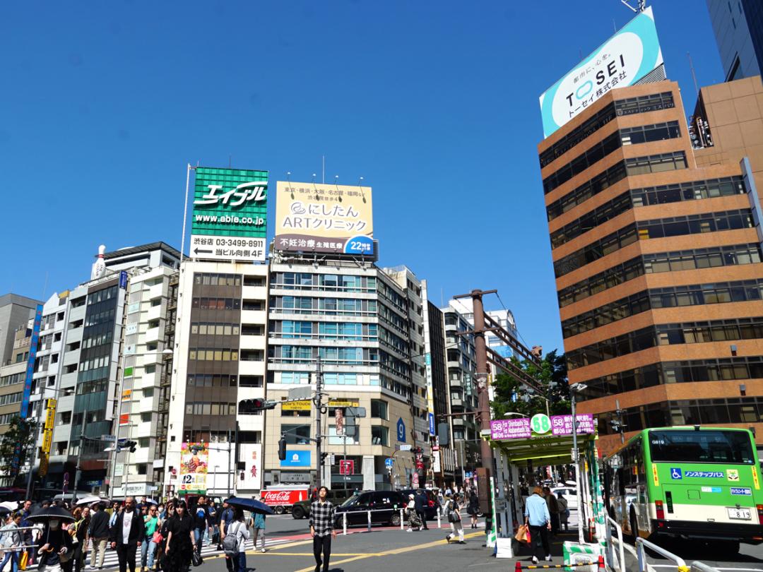 明治通りと大山街道(宮益坂)が交差する「宮益坂下」の風景 (撮影2025年4月29日)