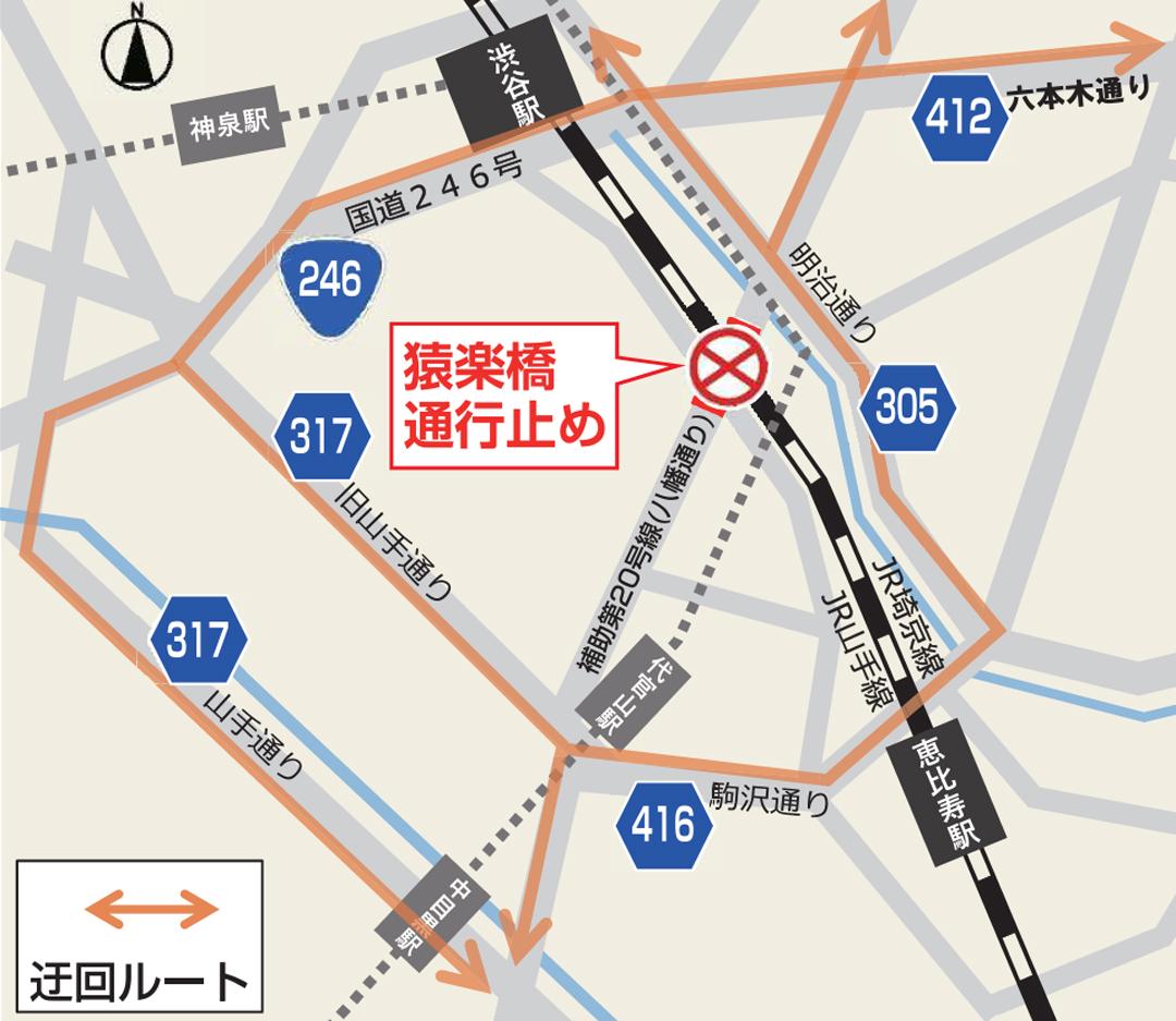 The biggest concern for local residents is that Sarugaku Bridge will be completely closed to traffic during the construction period. Two detours are planned for cars: 1) a route that uses National Route 246 from Old Yamate-dori (or Yamate-dori) to Roppongi-dori, and 2) a route that uses Komazawa-dori, Meiji-dori, Hachiman-dori, and Roppongi-dori.