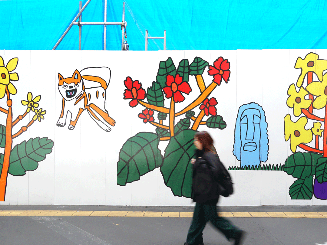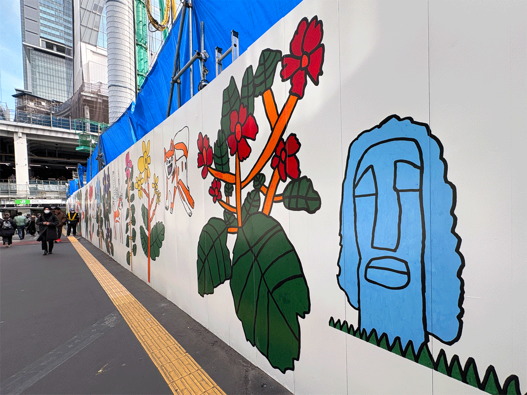 第1弾では、「花」や「コウモリ」など動植物をテーマにした既存作品約15点を展示し、無機質な仮囲いに生命感と華やぎをもたらした。第2弾では、その一部に渋谷を題材とした描き下ろし作品を組み込み、街の象徴と既存モチーフが呼応する構成。展示全体の長さも、前回よりも約10メートル延長された。