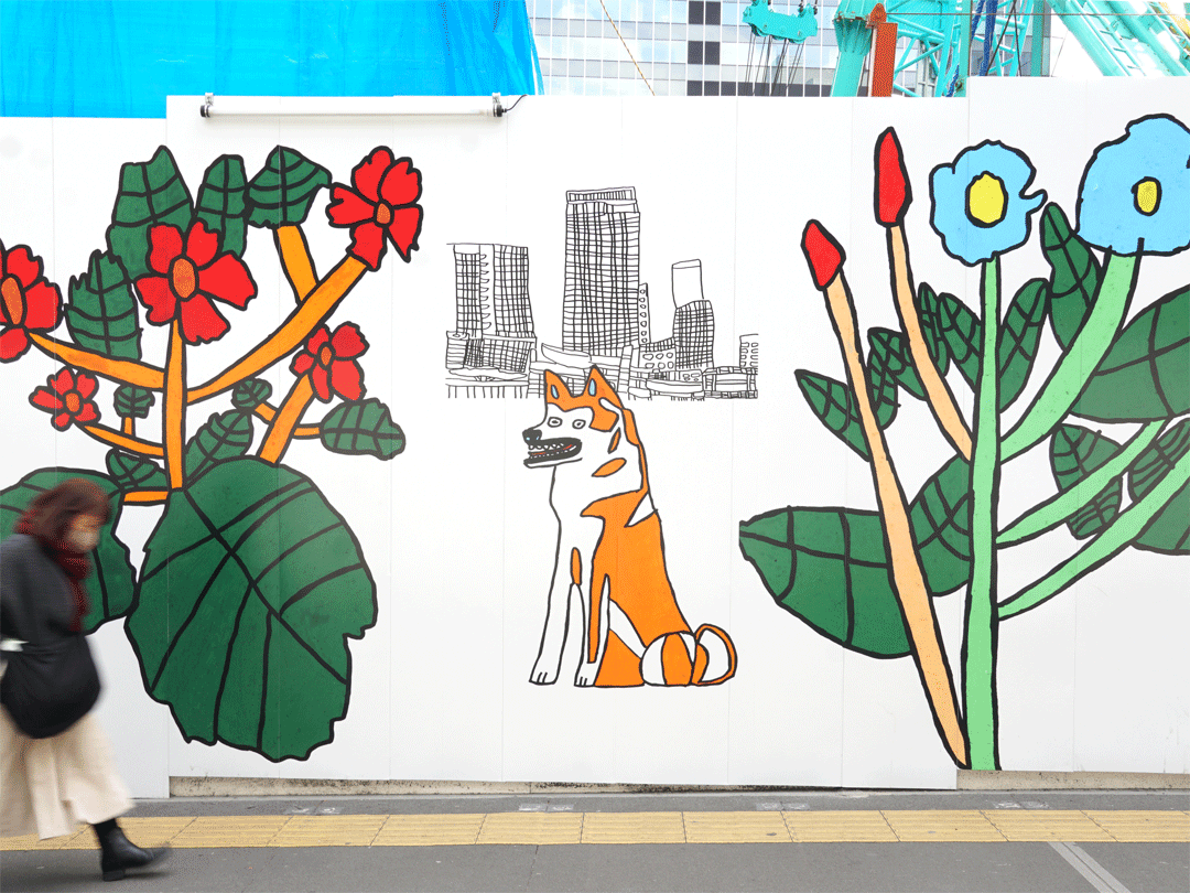 色鮮やかな「秋田犬」や「モヤイ像」が動植物モチーフと交差することで、渋谷の持つ多様性やエネルギーをより立体的に表現。無機質になりがちな工事現場に鮮やかな彩りと躍動感を加えている。