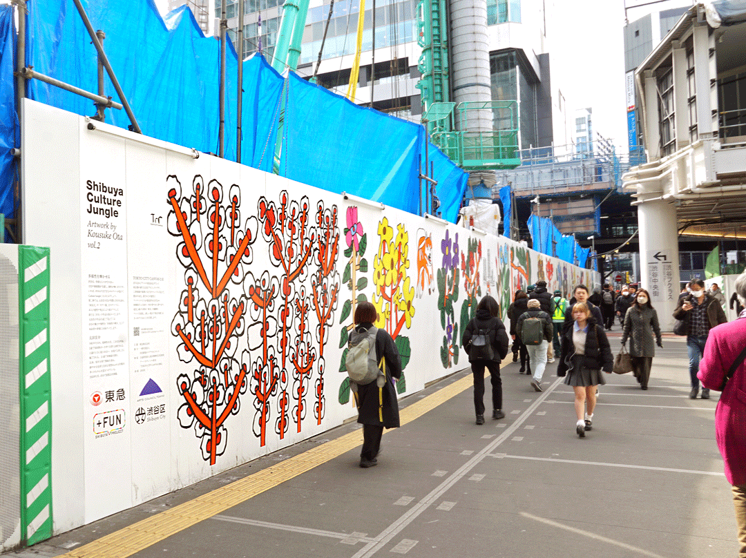 再開発が進む渋谷駅周辺では、動線変更や工事が続く中、ビジネスパーソンや買い物客、観光客らが日常的に行き交う。工事期間中ならではの景観を生かした今回の展示は、変化を続ける渋谷の街に新たな表情を添えている。