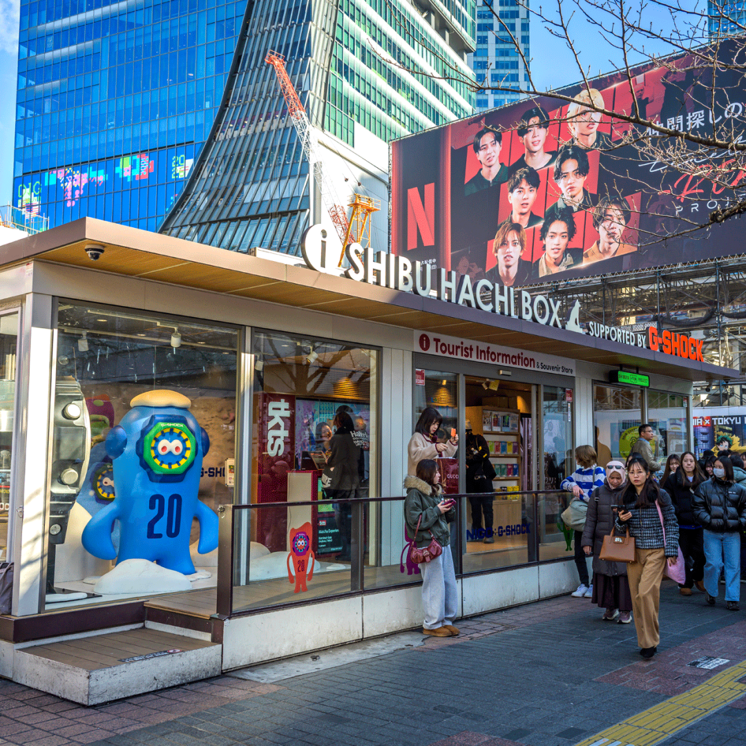 忠犬八公前廣場不僅有廣告媒體,還設有觀光指南設施“SHIBU HACHI BOX”。該設施於2020年開業,是澀穀站前區域管理部門以更新前身藍蛙旅遊信息中心的形式獲得的道路占用許可。澀穀區旅遊協會負責管理,進行旅遊信息和城市信息傳播。與廣告一樣,可以說它是利用公共空間的努力的一個例子。