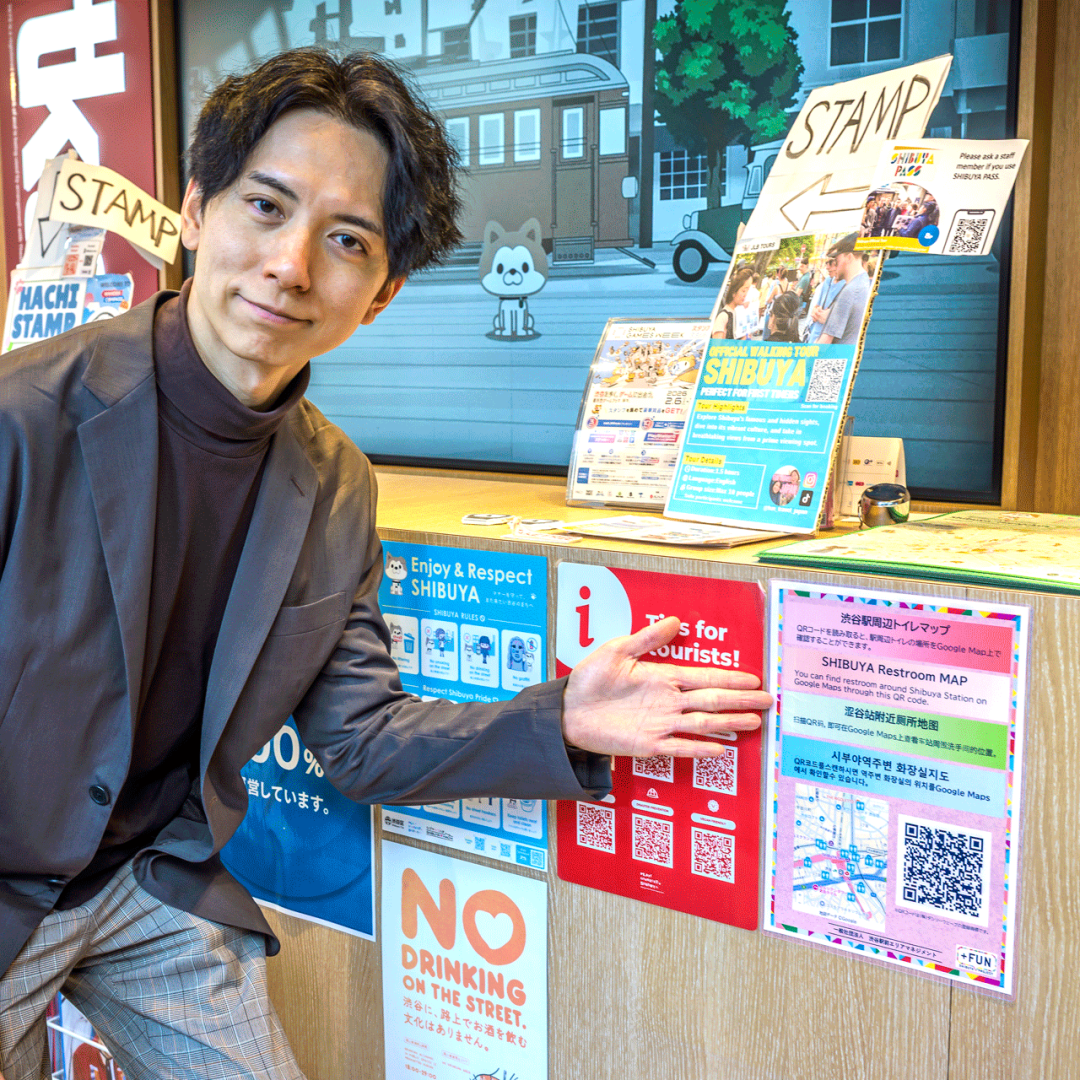 左) 位於忠犬八公前廣場的觀光指南設施“SHIBU HACHI BOX”也設置了澀穀站前區域管理。利用公共空間增強城市的吸引力和便利性。右) 磯本伸向旅遊問訊處張貼的“澀穀站周邊廁所地圖”。Elimane還支持外語,並為遊客提供詳細的服務