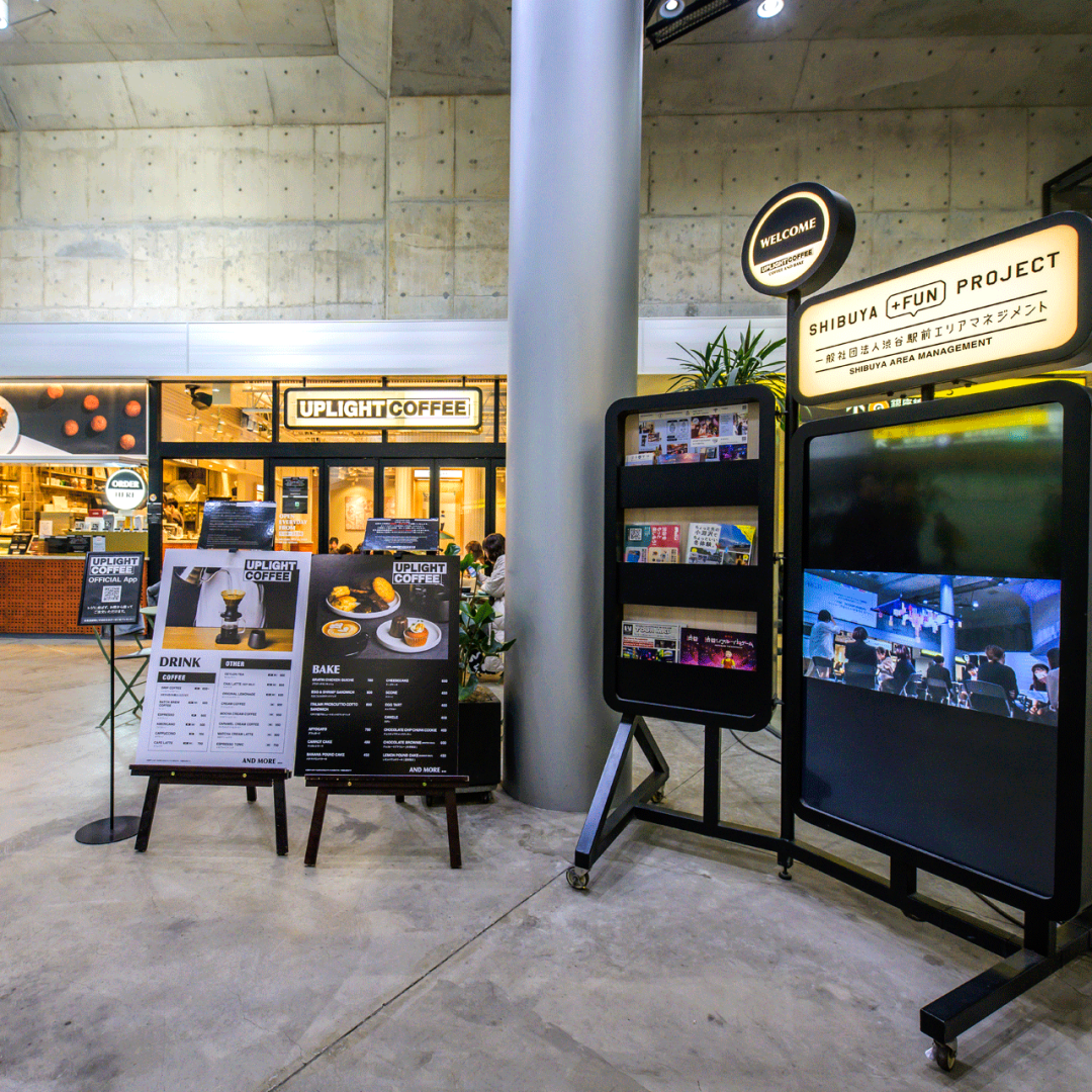 位於UPLIGHT COFFEE的澀穀站東口地下廣場 (B2F) 樓層,以360度環繞的形式也可以設置廣告插孔