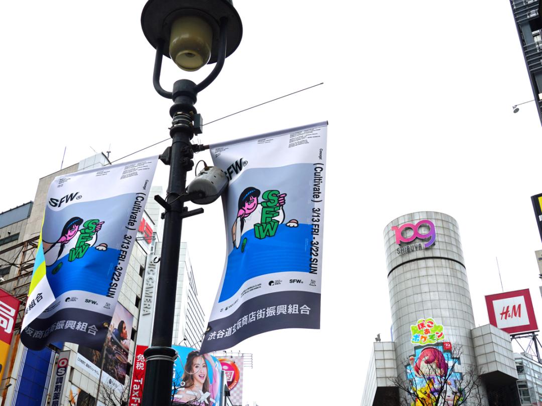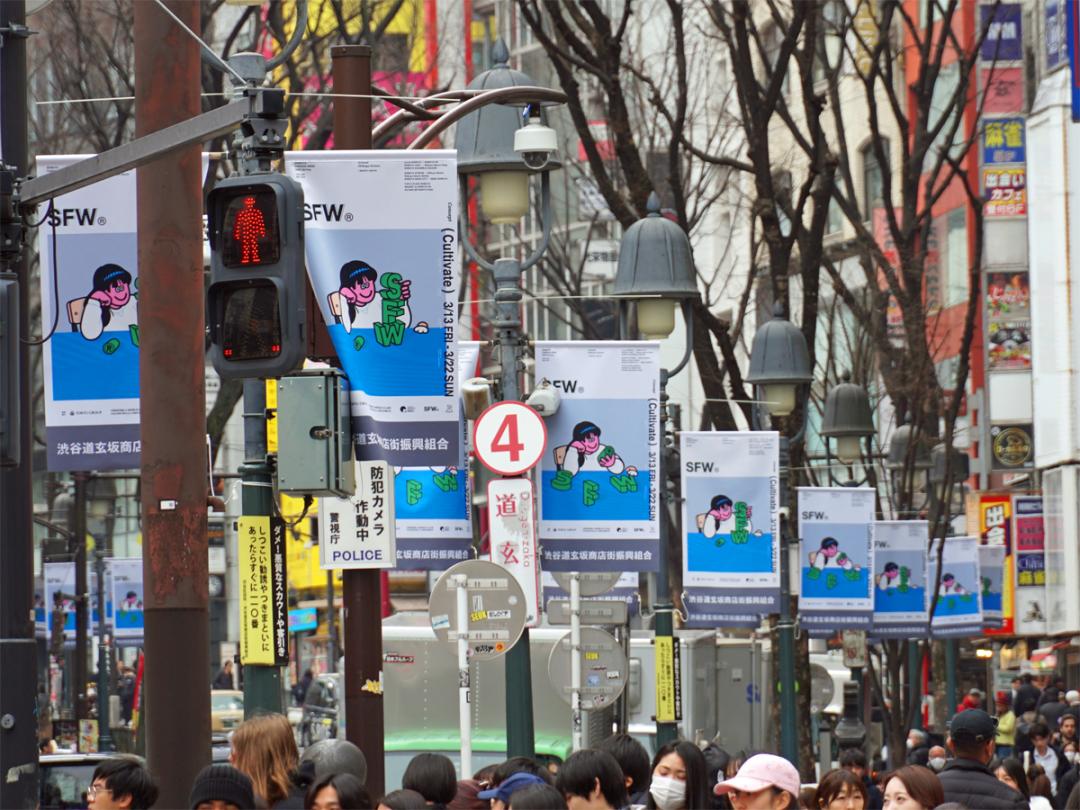街灯フラッグやデジタルサイネージ、公共空間をキービジュアルで装飾し、渋谷の街全体をSFW一色に演出する