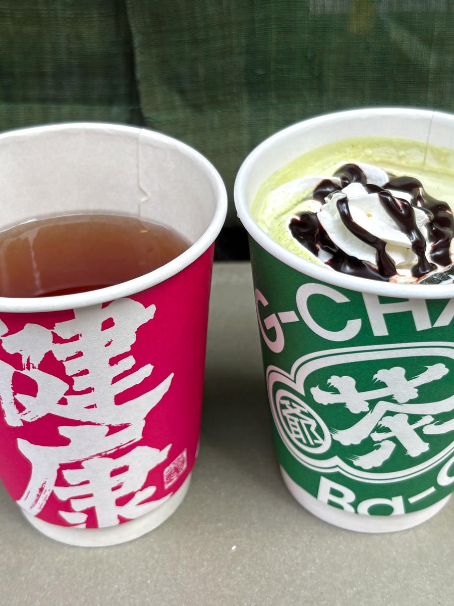 注文したのは、「健康」の文字が入ったピンクのカップで提供される「爺茶(ジンジャーほうじ茶)」(780円)と、「茶」の文字入りの緑のカップに入った「チョコレート抹茶ラテ」(960円)