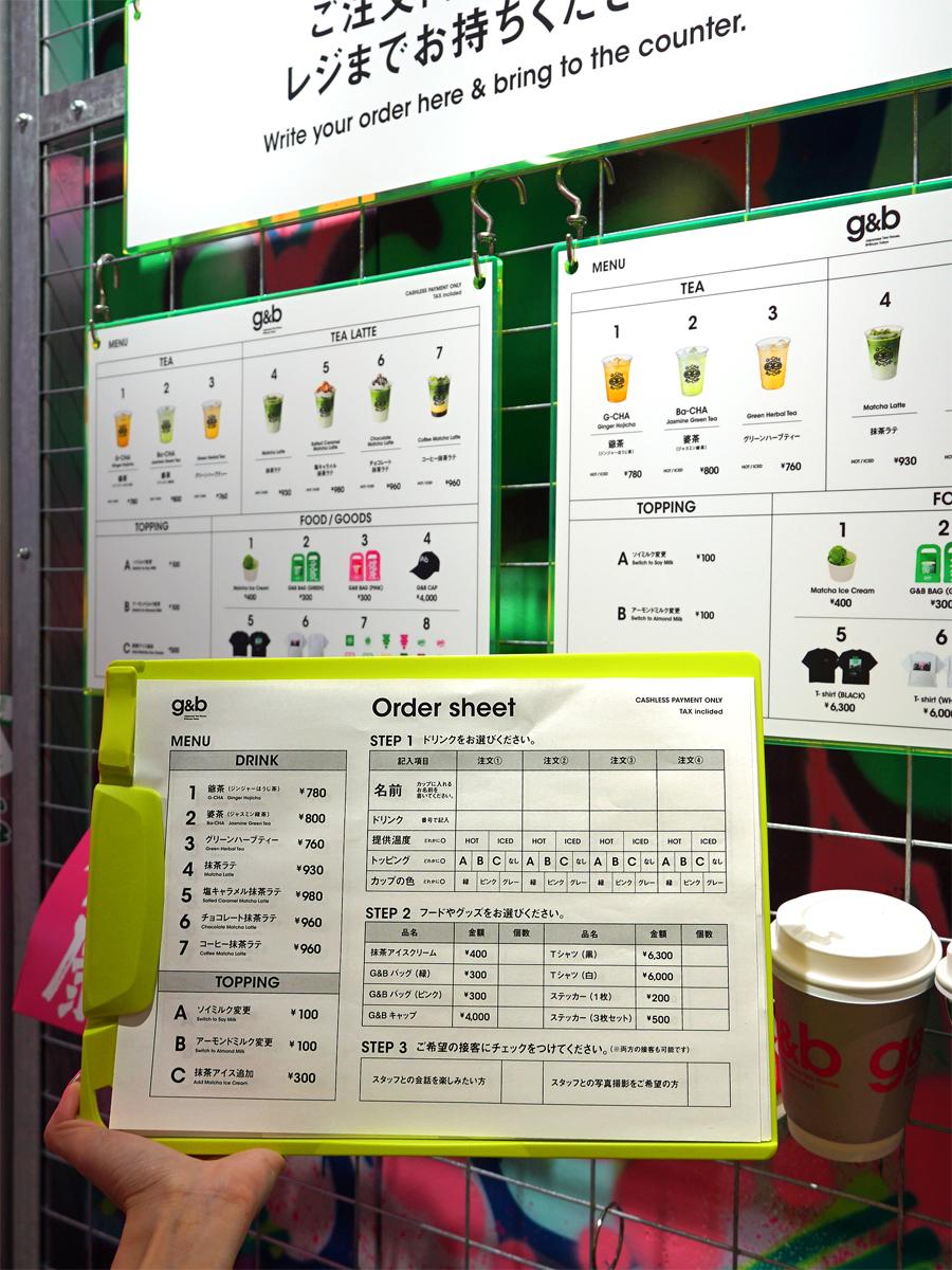 来店客は入店後、オーダーシートにドリンクの種類、温度、トッピング、カップの色、グッズ購入の有無などを記入し、レジで注文する。レジにはおじいちゃん、またはおばあちゃんのスタッフが1人座っており、そこで最初のコミュニケーションが始まる。この日は、サングラスをかけた73歳の京子さんが担当し、注文内容の確認と会計を行った。支払いは前払いで、キャッシュレス決済のみ。